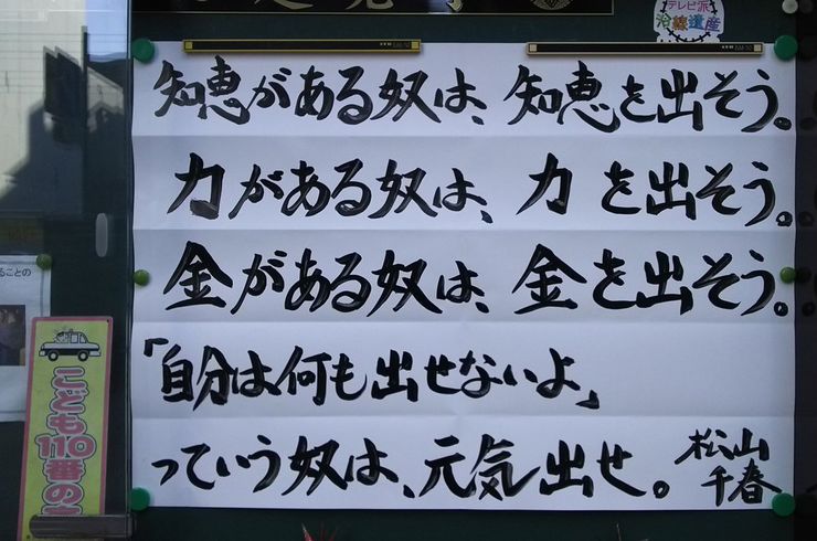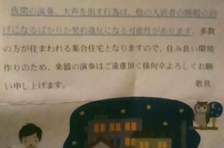 2018/11/05これは自宅に入っていたものです。 ギターの騒音に関する注意のお知らせなのにのほほんと楽しそうにギターを弾いているイラスト。 このセンスにじわりました(´・ω・`) さて、本日のおすすめはむろあじ刺、ボイルつぶ貝、あじフライ等でございます♪ -